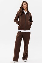 Комплект, состоящий из жакета и юбки. Жакет полуприлегающего силуэта выполнен из трикотажного полотна . По переду жакета настрочены карманы обманки с листочкой с декоративной тесьмой и пуговицей. Так же декоративная тесьма по горловине переда. Рукав втачной двухшовный. Спинка со средним швом и талиевыми вытачками. Застегивается жакет на 4 пуговицы и петли. Жакет без подкладки. Длина рукава- 20,5 см, длина по спинке-53 см.Юбка на широкой обтачке А- силуэта, на подкладке из плащевой ткани. По переднему и заднему полотнищу заложены складки. По бокам расположены наклонные карманы. Застежка сзади на потайную тесьму-молнию. Длина юбки по боковому шву- 83см.