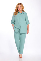 Комплект женский 2-ух предметный, состоящий из жакета и юбки. Жакет со спущенной линией плеча и цельнокроеным рукавом. По переду отрезная кокетка, воротник- стойка, рукава и планки. По переду настрочены нагрудные клапаны. Синка со средним швом. На левом рукаве о низу настрочена нашивка. Центральная застежка по планкам на 5 пуговиц и петель. Низ жакета можно регулировать с помощью эластичного шнура и фиксатора. Жакет без подкалки. Юбка на широкой обтачке А- силуэта, на подкладке. По переднему и заднему полотнищу заложены складки. По бокам расположены наклонные карманы. Застежка сзади на потайную тесьму-молни