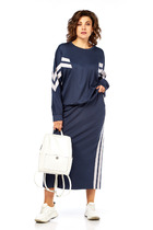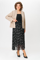 Костюм состоит из жакета и юбки. Жакет полуприлегающего силуэта, с цельнокроеным рукавом длиной 7/8. От плеча до низа рукава отделочная вставка из эко-кожи. По переду- фигурные наклонные рельефы. По правой стороне вставка из эко-кожи, настрочена нашивка контрастного цвета. Застёжка центрально-бортовая на 4 петли и 4 пуговицы. Юбка прямая, слегка зауженная к низу, на притачном поясе, по бокам с резинкой. Застёжка на 1 петлю и 1 пуговицу, и потайную молнию сзади в среднем шве, по низу шва разрез. Юбка на подкладке.