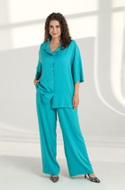 Комплект женский, из разных по фактуре тканей, состоящий из джемпера на трикотажной подкладке и брюк палаццо. Джемпер прямого силуэта, рукав втачной, одношовный. Горловина, низ рукава и низ изделия обработанны притачной трикотажной бейкой. Брюки палаццо, на притачном поясе с резинкой и тесьмой. У брюк - боковые карманы.