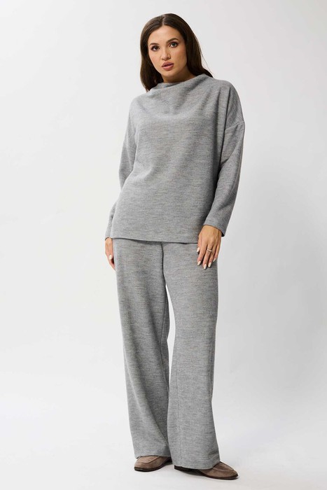 Костюм трикотажный женский состоит из джемпера и брюк. Джемпер прямого силуэта со спущенным втачным рукавом. В боковых швах обработаны разрезы. Горловина - цельнокроеная стойка. Брюки прямого силуэта. Талия обработана притачным поясом на резинке. В боковых швах - карманы