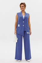 Комплект женский, состоящий из жилета и брюк. Жилет полуприлегающего силуэта, без подкладки. Плечо спущенное.Вырез V - образный, с воротником стойкой. По переду иммитация карманов с клапаном. Центральная застежка на пришивные кнопки.  Спинка со средним швом и вытачками. Джемпер без вытачек. Рукава втачные, одношовные, длинные. Ткань в рубчик. Прямой крой. Брюки прямого силуэта, слегка зауженные к низу. Пояс частично на резинке (по бокам), с шлевками для ремня. Застежка на гульфик с молнией и пуговицей. По бокам карманы с косым входом. Материал костюма костюмный, средней плотности, с гладкой фактурой. Без подкладки. Дополняет модель широкий пояс.