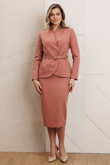 Жакет полуприлегающего силуэта с двубортной застёжкой на одну пару обтяжных, из основной ткани, пуговиц и одной потайной. Край борта фигурной формы,придающей динамичность жакету. На полочке выполнены фигурные рельефы, которые дополнены функциональными карманами, гармонично вписывающимися в общую структуру изделия. Спинка со средним швом и вертикальными рельефами из проймы. Воротник с цельнокроенной стойкой, что придает жакету элегантный и строгий вид. Рукава двухшовные, со шлицей в локтевом шве на одну пуговицу, также обтяжную из основной ткани.Жакет дополнен шлёвками и съемным поясом из основной ткани с пятью блочками на обтяжную пряжку, чем придает дополнительный акцент на талии.