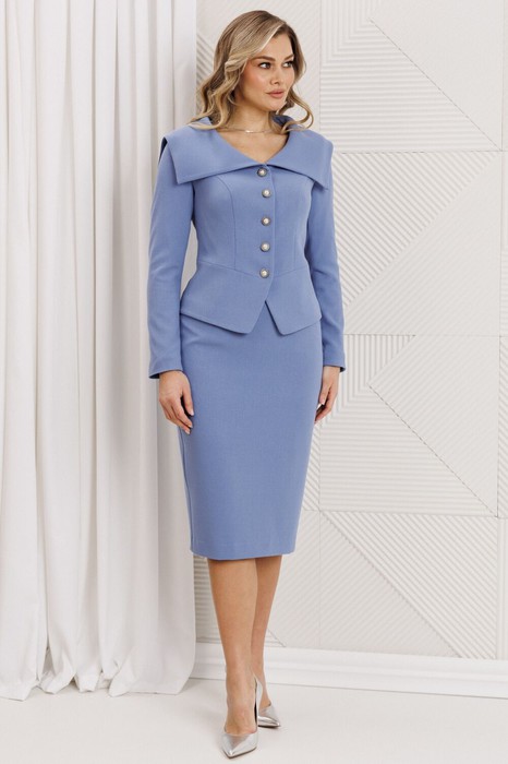 Этот нарядный костюм представляет собой элегантное и утонченное решение для особых случаев. Жакет полуприлегающего силуэта подчеркивает фигуру и обладает стильной центральной застежкой на изысканные пуговицы, что придаёт ему нотку шика. Рельефные линии, идущие от проймы, создают визуальную стройность, а баска по низу. Юбка прямая, зауженная к низу, сверху на притачном поясе. Юбка прямая, зауженная к низу, сверху на притачном поясе. Застежка на тесьму-молнию в среднем шве, который переходит в шлицу. Костюм на подкладке