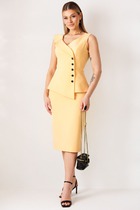 Элегантный костюм, состоящий из жакета без рукава и юбки. Жакет полуприлегающего силуэта. Отрезной бочок по переду, рельефная линия, выходящая из проймы, а также средний шов и талиевые вытачки по спинке создают утонченный силуэт. Жакет с отрезной, ассиметричной по переду баской. Со смещенной застежкой на пять отделочных пуговиц.  Горловина расширена и углублена по переду. Правый борт украшает волан фигурной формы. Юбка прямая, зауженная к низу. Сзади шлица и застежка на потайную молнию и пуговицу. Пояс с резинками по бокам. Жакет и юбка на подкладке.