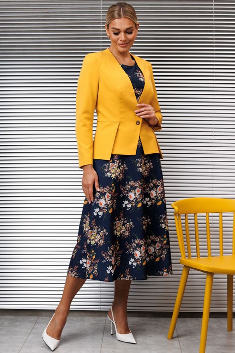 Двухпредметный костюм от бренда Мода-Юрс состоит из жакета и платья. Жакет полуприлегающего силуэта, отрезной по линии талии, спереди со шлицами. Спинка с талиевыми вытачками и средним швом. Рукав втачной, двухшовный. Застежка центральная на петли-пуговицы. Жакет на подкладке. Платье полуприлегающего силуэта, отрезное по линии талии. Верхняя часть платья по переду с рельефами. Нижняя часть платья А-силуэта. Спинка со средним швом и талиевыми вытачками. Застежка на тесьму-молнию в среднем шве. Рукав втачной, одношовный. Платье дополнено поясом, что позволяет регулировать ширину по линии талии.