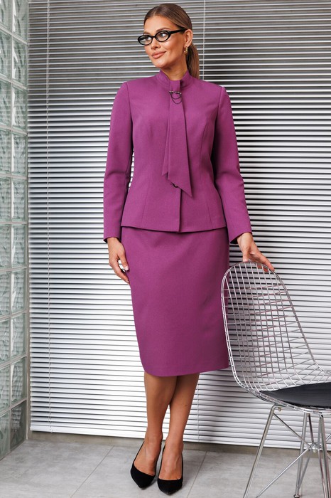 Комплект женский, состоящий из жакета и юбки. Жакет полуприлегающего силуэта с рельефами по переду и спинке. Спинка со средним швом. Рукав втачной, двухшовный. Воротник-стойка, переходящий в шарф. Юбка прямая, зауженная к низу, сверху на притачном поясе с резинкой. Застежка на тесьму-молнию в среднем шве, который переходит в шлицу. Костюм на подкладке. Главным декором и акцентом является съемная брошь.
