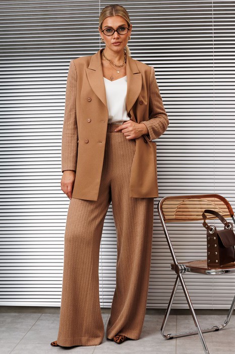 Костюм женский состоящий из жакета и брюк. Жакет выполнен из однотонного текстиля в сочетании с трикотажным полотном.