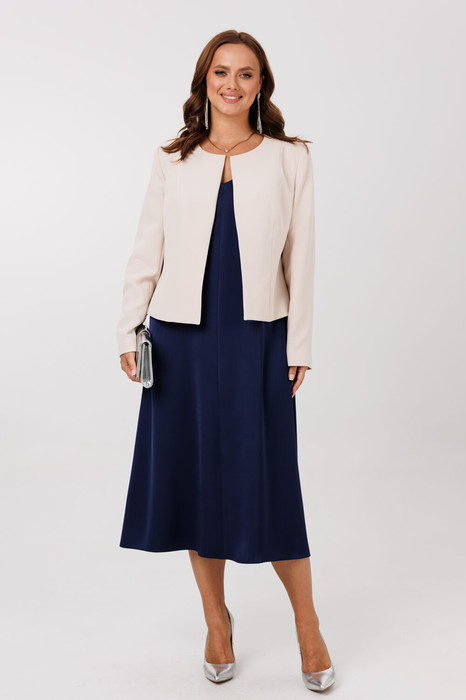 Жакет полуприлегающего силуэта, выполнен из костюмной ткани (тянется), на подкладке. По переду рельефные швы, застежка встык, горловина округлой формы. По спинке средний шов и талиевые вытачки. Рукава втачные, двухшовные. Жакет с плечевыми накладками.