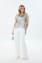 Блуза прямого свободного силуэта. По переду отделочная складка с декором в виде 3-х съемных брошей. По спинке средний шов. Горловина округлой формы. Рукава втачные, одношовные.