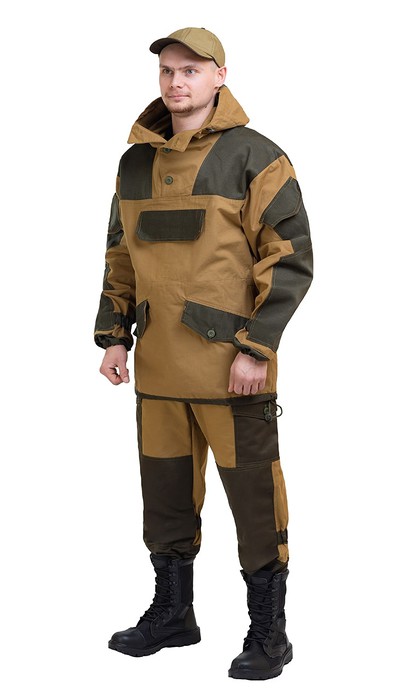 Куртка - анорак (без застежки): • свободного кроя; • кокетка, накладки и карманы из отделочной ткани; • 2 нижних прорезных кармана с клапаном, на петлю и пуговицу ; • верхний карман на пуговицу; • на рукавах по 1 накладному наклонному карману с клапаном на петлю и пуговицу • в области локтя усиливающие фигурные накладки; • низ рукавов на резинке; • капюшон двойной, с козырьком, имеет утягивающую кулису для регулировки по объему ; • подгонка по талии с помощью кулиски; Брюки: • свободного покроя; • гульфик с застёжкой на петлю и пуговицу; • 2 верхних кармана в боковых швах, • в области коленей, на задних половинках брюк в области сидения – усиливающие накладки; • 2 боковых накладных кармана с клапаном; • 2 задних накладных фигурных кармана на пуговицах; • крой деталей в области коленей препятствует их вытягиванию; • Пылезащитная юбка из бязи по низу брюк; • задние половинки под коленом собраны резинкой; • пояс на резинке; • низ на резинке;