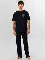 Костюм мужской из трикотажного полотна "кулирка" в комбинации двух видов: гладкокрашеного и набивного с тематическим рисунком, состоящий из футболки и брюк. Футболка из гладкокрашеного полотнас рукавами "реглан" длиной до локтя, горловиной овальной формы, обработанной втачной планкой и отделочной строчкой. В центре переда - принт, выполненгный в технике шелкографии. Брюки из полотна с набивным рисунком длинные, прямые, на притачном поясе с эластичной тесьмой внутри и карманами в боковыых швах.