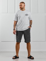 Костюм мужской, состоящий из футболки и брюк. Футболка однотонная с принтом на груди; модель свободная, со спущенной линией плеч, овальным вырезом горловины. Брюки из полотна с набивным рисунком эксклюзивного дизайна, прямые, с боковыми карманами с обтачными входами, на притачном поясе с отстроченной эластичной тесьмой.