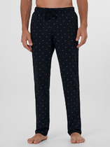 Костюм мужской из трикотажного полотна "кулирка" в комбинации двух видов: гладкокрашенного и с рисунком в крупную клетку, сочетающихся между собой по цвету, состоящий из джемпера и брюк. Джемпер - из гладкокрашеного полотна, свободного покроя, с длинными втачными рукавами и приспущенными плечами, с горловиной овальной формы и тематическим принтом, выполненным в технике шелкографии. Горловина, нижние срезы рукавов и низ изделия обработаны подгибкой с отделочным широким кантом контрастного цвета. Брюки - из полотна в клетку, свободного покроя, прямые, на притачном поясе с эластичной тесьмой внутри, с карманами в боковых швах. Нижние срезы обработаны подгибкой.