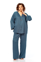 Костюм трехпредметный: состоит из блузы, юбки и комбинации. Блуза свободного силуэта с присборенной горловиной, обработанной бейкой. Спинка со средним швом, переходящим в разрез. Рукава реглан с асимметричными воланами. Юбка макси расширенного силуэта на резинке. Нижний край блузы с двойным воланом. Нижнее платье комбинация на регулируемых бретелях.