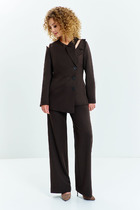 Костюм трехпредметный: состоит из верхнего и нижнего платьев, жилета. Верхнее платье макси свободного кроя прямого силуэта. Центральная застежка на петли и пуговицы. Спинка присборена в верхней части, с притачной кокеткой. Горловина оформлена воротником-стойкой. Объемный втачной рукав со спущенной проймой, присбореный по окату. По низу платья широкая отрезная оборка с густой сборкой. Нижнее платье-комбинация на регулируемых бретелях. Жилет удлиненный свободного прямого силуэта, воротник пиджачного типа. Линия низа по переду и спинке фигурная ассиметричная. Короткий рукав-крылышко. Талия фиксируется съемным ремнем из экокожи, для которого в боковых швах оформлены шлевки. Ремень идёт в комплекте к изделию.