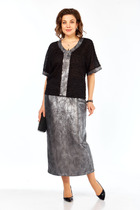 Костюм двухпредметный: состоит из блуза и брюк. Блуза прямого кроя с центральной застёжкой на петли и пуговицы. Вырез горловины глубокий округлый. Линия плеча приспущена. На рукавах изделия заложена декоративная сборка с регулируемыми завязками. В комплект к изделию идёт узкий пояс из основной ткани с авторским украшением ручной работы. Брюки свободного кроя, верхний срез представлен широкой резинкой, с карманами.