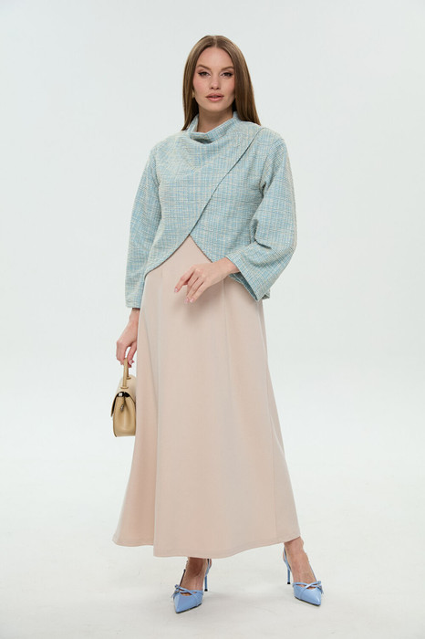 Костюм двухпредметный: состоит из джемпера-кейпа и платья. Укороченный джемпер-кейп с округлой горловиной и фигурным лифом. Рукав втачной широкий , от линии локтя до запястья есть дополнительное отверстие для рук. Платье длиной миди отрезное по линии талии приталенного силуэта. Нижняя часть платья имеет небольшое расклешение.Прилегание по переду создано за счет нагрудных вытачек, переведенных в боковой шов, и талиевых вытачек. На спинке талиевые вытачки и средний шов. Застежка платья на потайную молнию в среднем шве спинки. Плечевой пояс оформлен кокетками по переду и спинке, напоминающими по форме рукав реглан. Плечо немного приспущено.