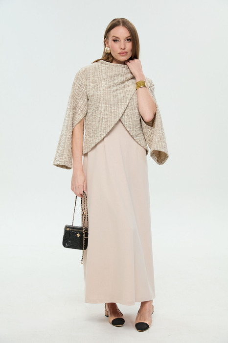 Костюм двухпредметный: состоит из джемпера-кейпа и платья. Укороченный джемпер-кейп с округлой горловиной и фигурным лифом. Рукав втачной широкий , от линии локтя до запястья есть дополнительное отверстие для рук. Платье длиной миди отрезное по линии талии приталенного силуэта. Нижняя часть платья имеет небольшое расклешение.Прилегание по переду создано за счет нагрудных вытачек, переведенных в боковой шов, и талиевых вытачек. На спинке талиевые вытачки и средний шов. Застежка платья на потайную молнию в среднем шве спинки. Плечевой пояс оформлен кокетками по переду и спинке, напоминающими по форме рукав реглан. Плечо немного приспущено.