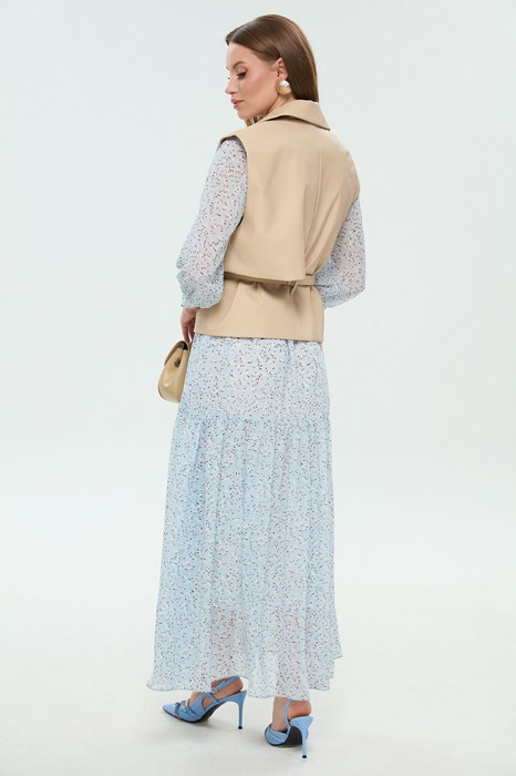 Костюм двухпредметный: состоит из платья и жилета. Платье макси прямого свободного силуэта с воланом по низу изделия. Рукав втачной с манжетой. Горловина округлая. Изделие на подкладке. По спинке вырез капелька с застёжкой на пуговицу. Жилет из экокожи прямого силуэта с воротником пиджачного типа. По правой пройме переда расположена фигурная деталь "крылышко". Спинка со средним швом. По низу правого переда и низу правой спинки фигурная деталь. По левой части переда и левой части спинки отлетная кокетка. Изделие идёт в комплекте с ремнем из экокожи.