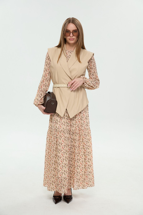 Костюм двухпредметный: состоит из платья и жилета. Платье макси прямого силуэта с округлым вырезом, отрезное по линии талии. Рукав немного приспущен, нижний край рукавов оформлен резинкой. По спинке вырез капелька с застёжкой на пуговицу. Изделие на подкладке. По низу юбки широкий волан. Жилет удлиненный свободного прямого силуэта, воротник пиджачного типа. Линия низа по переду и спинке фигурная ассиметричная. Короткий рукав-крылышко. Талия фиксируется съемным ремнем из экокожи, для которого в боковых швах оформлены шлевки. Ремень идёт в комплекте к изделию.