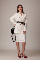 Костюм двухпредметный: жилет и брюки. Жилет полуприлегающего силуэта, на подкладке. По переду рельефа карманы "листочки", застёжка на петли-пуговицы. По спинке вытачки и хлястик. Длина изделия 50 см. Брюки полуприлегающего силуэта,зауженные к низу. По переду боковой карман, застежка на тесьму-молнию и пуговицу. Длина брюк 99 см.
