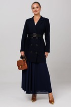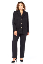 Костюм двухпредметный из облегченного денима: состоит из рубашки и юбки. Укороченная рубашка прямого кроя со спущенной линией плеча. Горловина обработана рубашечным воротником с отрезной стойкой. Застёжка центральная на кнопки. Спереди есть нагрудные карманы. Низ рукава обработан притачной манжетой, застёгивается на кнопки. Юбка длиной миди, расклешенная к низу, с асимметричным низом. Пояс притачной, по спинке собран на резинку. Переднее полотнище состоит из трех частей. Правая часть скреплена отделочной строчкой и кнопками. В боковых швах изделия расположены карманы. По спинке изделия идёт средний шов и две вытачки для удачной посадки по фигуре. Юбка без подкладки.