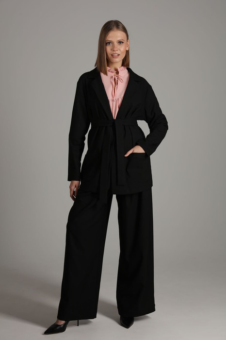 Костюм двухпредметный: состоит из жакета и брюк. Жакет свободного прямого силуэта длиной ниже линии бедер из костюмной ткани. Изделие со съемным поясом, на подкладке и накладными карманами. Рукав втачной, двухшовный, пройма спущена. Воротник английский. Застежка не предусмотрена. Элегантные брюки прямого кроя с боковыми карманами с отрезным бочком. Застежка на молнию и пуговицу. По переду - складки. Задние половинки с талиевыми вытачками и прорезными карманами с листочкой. Верхний срез обработан притачным поясом. Низ обработан швом в подгибку.