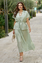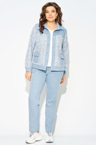Костюм двухпредметный: состоит из рубашки - кропа и юбки. Укороченная рубашка из денима. Модель свободного кроя собрана на резинку по нижнему краю. Отложной воротник. Изделие застегивается на кнопки. Юбка - солнце длиной миди из облегчённого денима с узким поясом. В боковых швах расположены карманы. Застежка на кнопки с цельнокроеной планкой. Длина около 94 см. Изделие без подкладки.