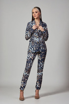 Костюм двухпредметный: состоит из блузы и юбки. Блуза прямого силуэта свободного кроя с втачным рукавом со спущенной проймой. По горловине переда планка с запахом. Воротник с цельнокроенной стойкой. По низу переда имеется нашивка из экокожи. Боковые швы с разрезами. Юбка длиной миди прямая на резинке. Разрез по переду. Изделие без подкладки.
