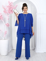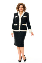 Костюм двухпредметный: состоит из блузы и юбки. Блуза прямого силуэта свободного кроя с втачным рукавом со спущенной проймой. По горловине переда планка с запахом. Воротник с цельнокроенной стойкой. По низу переда имеется нашивка из экокожи. Боковые швы с разрезами. Юбка длиной миди прямая на резинке. Разрез по переду. Изделие без подкладки.