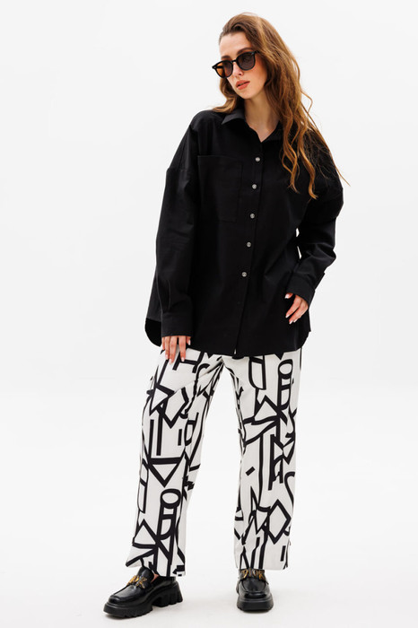 Костюм двухпредметный: состоит из рубашки и брюк. Рубашка прямого кроя объёма оверсайз со спущенной линией плеча с асимметричным бочком. Горловина обработана рубашечным воротником с отрезной стойкой. Застёжка центральная на петли и пуговицы. Есть нагрудный карман. Низ рукава обработан притачной манжетой, застёгивается на пуговицы. Брюки средней посадки, свободные вверху, слегка зауженные к низу с наклонными боковыми карманами. Низ брючины ассиметричный, декорирован пуговицами. Пояс широкий отрезной, сзади на эластичной тесьме-резинке, по переду застежка на петли-пуговицы.