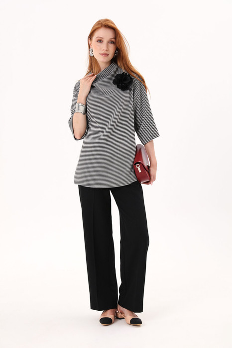 Костюм двухпредметный: состоит из джемпера и брюк. Джемпер прямого свободного силуэта. Горловина с цельнокроеным воротником-стойкой. Рукав втачной широкий, три четверти. В комплект входит съёмная авторская брошь-цветок ручной работы. Брюки свободного кроя, верхний срез представлен широкой резинкой, с карманами.