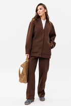 Костюм двухпредметный: состоит из блузы , брюк. Блуза свободного прямого кроя прямого силуэта с V-образным вырезом. Воротник стояче-отложной рубашечного типа, застёгивается на декоративную пуговицу и петлю. Рукава объёмные, собраны на резинку. В боковых швах и по переду разрезы. Брюки с притачным поясом и с карманами в боковых швах..