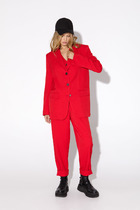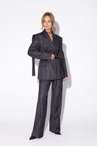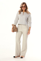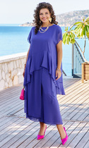 Костюм двухпредметный: состоит из блузы , брюк. Блуза свободного прямого кроя прямого силуэта с V-образным вырезом. Воротник стояче-отложной рубашечного типа, застёгивается на декоративную пуговицу и петлю. Рукава объёмные, собраны на резинку. В боковых швах и по переду разрезы. Брюки с притачным поясом и с карманами в боковых швах..