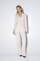 Костюм комбинированный двухпредметный: состоит из жакета и брюк. Жакет рубашечного типа прямого силуэта с асимметричным низом. Рукав втачной со спущенной линией плеча, фиксируется на пату. Застежка центральная на петли и пуговицы, смещённая по косой. На левой полочке накладной карман с клапаном. Воротник отложной на стойке до половины спинки. Брюки свободного кроя из гладкой ткани сочетают элегантность и комфорт. Широкая резинка на поясе и наличие функциональных карманов подчеркивают удобство модели.