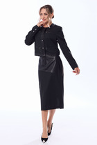 Костюм двухпредметный: состоит из жакета и юбки. Жакет прямого силуэта, воротник пиджачного типа, рукав одношовный, втачной с незначительно спущенной линией плеча, длинный, с притачной манжетой, декорированной разрезом. По линии ткани настрачная кулиса с завязками из основной ткани. Застежка центрально-бортовая. Линия низа верхней части фигурная ассиметричная. Юбка - солнце макси с узким поясом. В боковых швах расположены карманы. Застёжка на петлю и пуговицу и молнию по спинке.