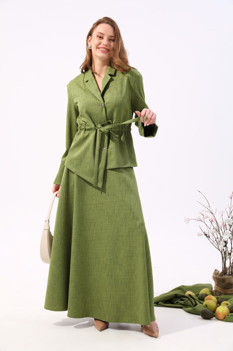 Костюм двухпредметный: состоит из жакета и юбки. Жакет прямого силуэта, воротник пиджачного типа, рукав одношовный, втачной с незначительно спущенной линией плеча, длинный, с притачной манжетой, декорированной разрезом. По линии ткани настрачная кулиса с завязками из основной ткани. Застежка центрально-бортовая. Линия низа верхней части фигурная ассиметричная. Юбка - солнце макси с узким поясом. В боковых швах расположены карманы. Застёжка на петлю и пуговицу и молнию по спинке.