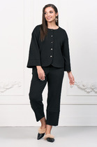 Костюм двухпредметный: состоит из джемпера и юбки. Джемпер-кейп прямого свободного силуэта. Горловина с цельнокроеным воротником-стойкой. Рукав втачной широкий, от линии локтя до запястья есть дополнительное отверстие для рук. Декорирован цветком из контрастной ткани. Юбка - солнце с узким поясом. В боковых швах расположены карманы. Застёжка на петлю и пуговицу и молнию по спинке.