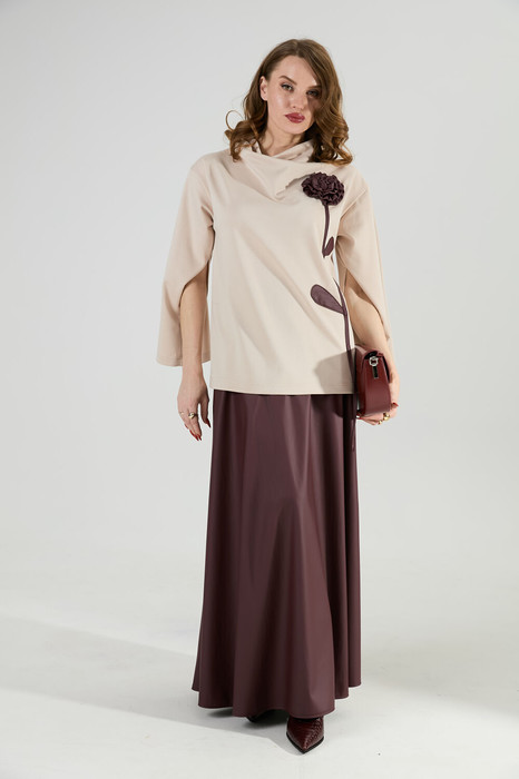 Костюм двухпредметный: состоит из джемпера и юбки. Джемпер-кейп прямого свободного силуэта. Горловина с цельнокроеным воротником-стойкой. Рукав втачной широкий, от линии локтя до запястья есть дополнительное отверстие для рук. Декорирован цветком из контрастной ткани. Юбка - солнце с узким поясом. В боковых швах расположены карманы. Застёжка на петлю и пуговицу и молнию по спинке.