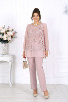 Костюм двухпредметный: состоит из жакета и юбки. Жакет прямого силуэта с имитацией центральной застёжки на пуговицы. Рукав втачной одношовный, длиной три четверти,застегивающийся на пату. Воротник пиджачного типа . Линия низа фигурная, симметричная . По левому переду расположена декоративная деталь. Юбка длиной миди, расклешенная к низу, с асимметричным низом. Пояс притачной, по спинке собран на резинку. Переднее полотнище состоит из трех частей. Правая часть скреплена отделочной строчкой и кнопками. В боковых швах изделия расположены карманы. По спинке изделия идёт средний шов и две вытачки для удачной посадки по фигуре. Юбка без подкладки.