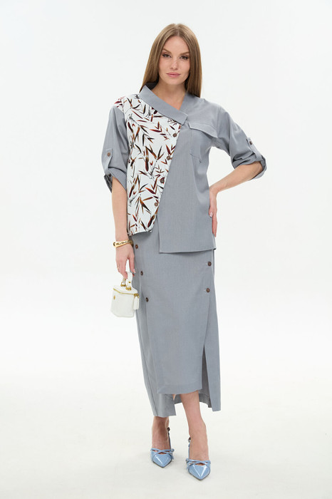 Костюм двухпредметный: состоит из жакета и юбки. Жакет рубашечного типа прямого силуэта с асимметричным низом. Рукав втачной со спущенной линией плеча, фиксируется на пату. Застежка центральная на петли и пуговицы, смещённая по косой. Воротник отложной на стойке до половины спинки.Юбка длиной миди, расклешенная к низу, с асимметричным низом. Пояс притачной, по спинке собран на резинку. Переднее полотнище состоит из трех частей. Правая часть скреплена отделочной строчкой и кнопками. В боковых швах изделия расположены карманы. По спинке изделия идёт средний шов и две вытачки для удачной посадки по фигуре. Юбка без подкладки.