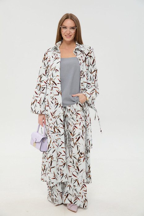 Костюм трехпредметный: состоит из кардигана-платья, брюк и топа. Платье-кардиган макси с центральной отрезной застёжкой на потайную планку на петли и пуговицы. По переду и спинке цельнокроеные складки на уровне талии. Рукав втачной, одношовный рубашечного типа. По низу рукава пробиты петли и вставлена завязка для фиксации сборки . Воротник рубашечный стояче отложной. В комплект к изделию идёт пояс из основной ткани для максимально комфортного регулирования объёма. Брюки свободного кроя, верхний срез представлен широкой резинкой, с карманами. По центру правой брючины расположена планка с функционирующими петлями и пуговицами. Топ на тонких регулируемых бретелях.