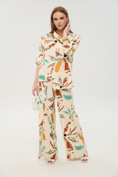 Костюм двухпредметный: состоит из жакета и брюк. Жакет рубашечного типа прямого силуэта с асимметричным низом. Рукав втачной со спущенной линией плеча, фиксируется на пату. Застежка центральная на петли и пуговицы, смещённая по косой. Воротник отложной на стойке до половины спинки. Брюки свободного кроя, верхний срез представлен широкой резинкой, с карманами. По центру правой брючины расположена планка с функционирующими петлями и пуговицами.