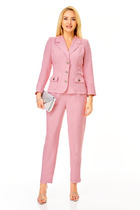 Костюм двухпредметный: состоит из жакета и брюк. Жакет прямого силуэта с имитацией центральной застёжки на пуговицы. Рукав втачной одношовный, длиной три четверти,застегивающийся на пату. Воротник пиджачного типа . Линия низа фигурная, симметричная . Брюки свободного кроя, верхний срез представлен широкой резинкой, с карманами. По центру правой брючины расположена планка с функционирующими петлями и пуговицами.