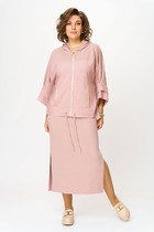 Костюм двухпредметный: состоит из жакета и брюк. Жакет прямого силуэта, воротник пиджачного типа, рукав одношовный, втачной с незначительно спущенной линией плеча, длиной три четверти, с патой. По линии ткани настрачная кулиса с завязками из основной ткани. Застежка центрально-бортовая. Линия низа верхней части фигурная ассиметричная. Брюки свободного кроя, верхний срез представлен широкой резинкой, с карманами. По центру правой брючины расположена планка с функционирующими петлями и пуговицами.