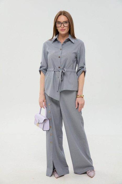 Костюм двухпредметный: состоит из жакета и брюк. Жакет прямого силуэта, воротник пиджачного типа, рукав одношовный, втачной с незначительно спущенной линией плеча, длиной три четверти, с патой. По линии ткани настрачная кулиса с завязками из основной ткани. Застежка центрально-бортовая. Линия низа верхней части фигурная ассиметричная. Брюки свободного кроя, верхний срез представлен широкой резинкой, с карманами. По центру правой брючины расположена планка с функционирующими петлями и пуговицами.