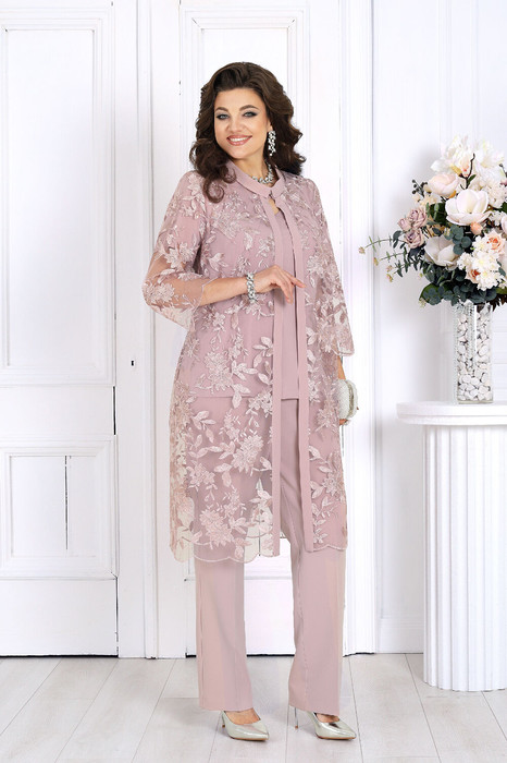 Комплект брючный 3-х предметный, состоящий из кардигана, выполненного из гипюра, джемпера, выполненного из трикотажного полотна «масло» и брюк, выполненных из костюмно-плательной ткани. Кардиган, полуприлегающего силуэта, длиной по середине спинки 107 см от шва втачивания воротника. Перед с нагрудными вытачками, выходящими из пройм. Борта переда обработаны притачными планками из костюмно-плательной ткани. Спинка с талиевыми вытачками. Низа переда, спинки оформлены фестонами. Горловина спинки и переда округлая, по переду углубленная, с воротником-стойкой. Концы воротника прямоугольной формы. Кардиган с застежкой на декоративный крючок на уровне воротника. Воротник выполнен из костюмно-плательной ткани. Рукава втачные, одношовные. Длина рукавов 51 см. Низа рукавов оформлены фестонами. Джемпер полуприлегающего силуэта, длиной по середине спинки 66 см. Боковые части переда с рельефами от горловины до низа, и центральной частью переда, переходящей в прямоугольный вырез горловины. Горловина переда и спинки округлая, углубленная, окантованная. Спинка с талиевыми вытачками. Рукава втачные, одношовные, длиной 21 см. Брюки классические, с посадкой на талии, на притачном поясе, с застёжкой на тесьму-«молния», расположенную в среднем шве передних половинок, и 1 петлю и 1 пуговицу на поясе. Передние и задние половинки брюк с талиевыми вытачками, идущими от пояса вниз, с заутюженными стрелками, с боковыми наклонными карманами на передних половинках. Для лучшего прилегания брюк в области талии в поясе со стороны спинки вставлена резинка.