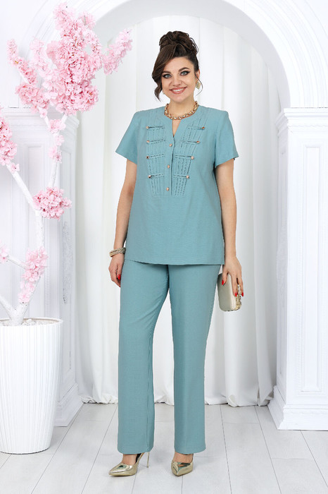 Комплект брючный 2-х предметный, состоящий из блузки и брюк. Блузка полуприлегающего силуэта, выполнена из вискозного полотна. Модель с плечевыми накладками и разрезами в боковых швах. Перед декорирован вставками с застроченными вертикальными защипами и отрезными фигурными планками, застегивающимися на 3 петли и 3 пуговицы. От планок к швам притачивания вставок направлены навесные петли, застегнутые на пуговицы. Спинка со средним швом; круглая горловина спинки обработана отрезной фигурной бейкой. Рукав короткий, втачной. Длина блузки – 66,5 (46-50 р-р) см, 69 см (52-60 р-р); длина рукава – 19,5 см (46-50 р-р), 20,0 (52-60 р-р) см. Брюки классические, с посадкой на талии, выполнены из вискозного полотна. Модель с центральной застёжкой на тесьму-«молнию», на притачном поясе, застегивающемся на петлю и пуговицу. Передние и задние половинки брюк с талиевыми вытачками, направленными от пояса вниз. Спереди обработаны боковые наклонные карманы. Для лучшего прилегания брюк в области талии в поясе по задним половинкам вставлена эластичная лента. Длина брюк по боковому (с поясом) – 101,5 см (46-50 р-р), 102,5 см (52-54 р-р), 103,5 см (56-60 р-р).