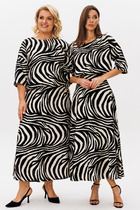 Туника полуприлегающего силуэта, выполнена из ткани «крэш-вискоза». Модель с плечевыми накладками, без застежки. Перед с нагрудными вытачками, спинка – с талиевыми. Боковые спинки и левый боковой переда равны по длине; правый боковой переда укорочен. Косой низ переда поддерживается патой, оба конца которой входят в боковой шов; вдоль длинного края паты частично застрочена односторонняя складка. Вырез горловины округлый, углубленный спереди. Рукав втачной, короткий, на притачной манжете, застегивающейся на 2 петли и 2 пуговицы; по середине рукава фигурный округлый вырез. Перед туники декорирован аппликацией, выполненной из страз. Длина туники – 101 см; длина рукава (с манжетой) – 47 см.
